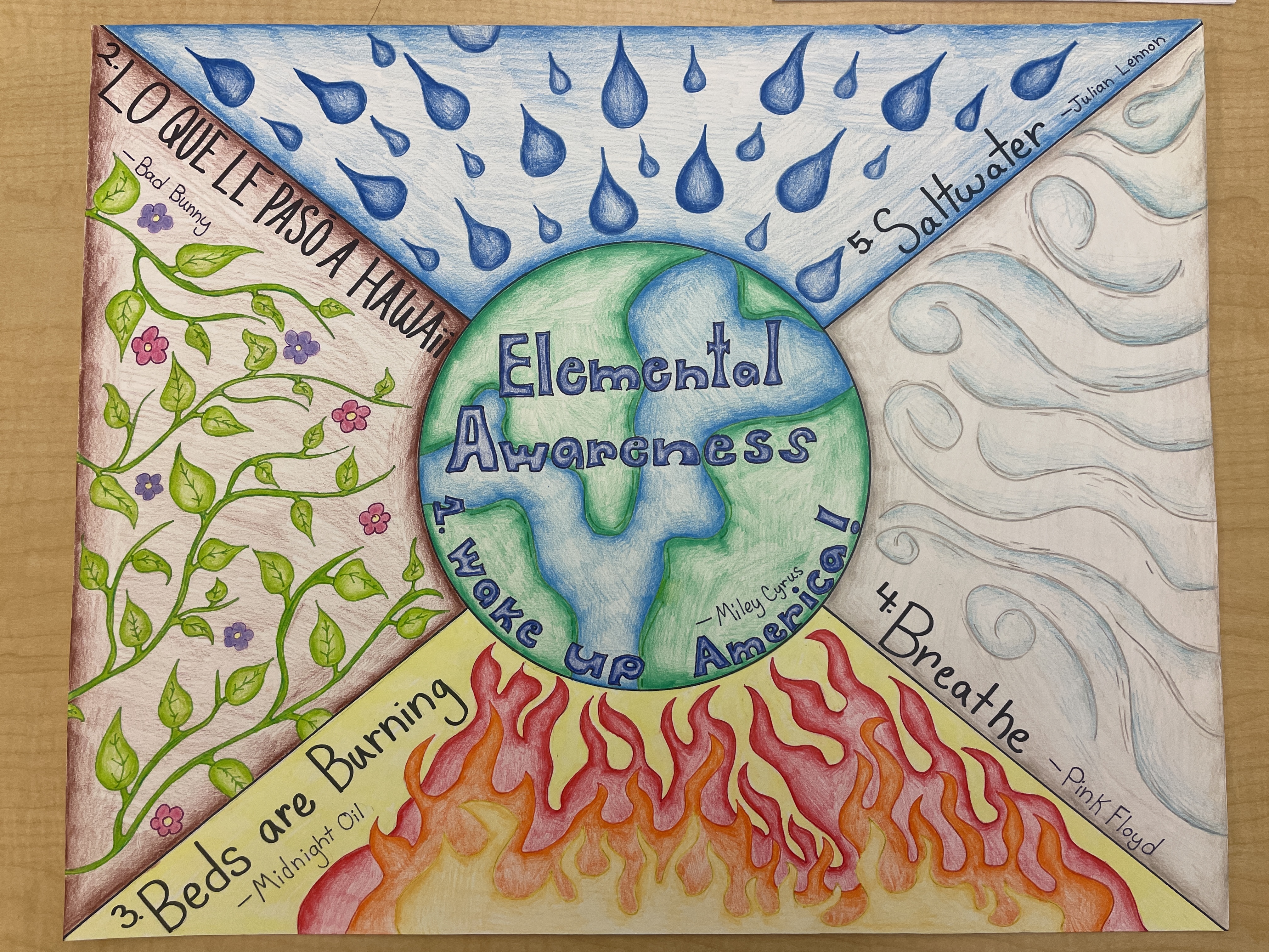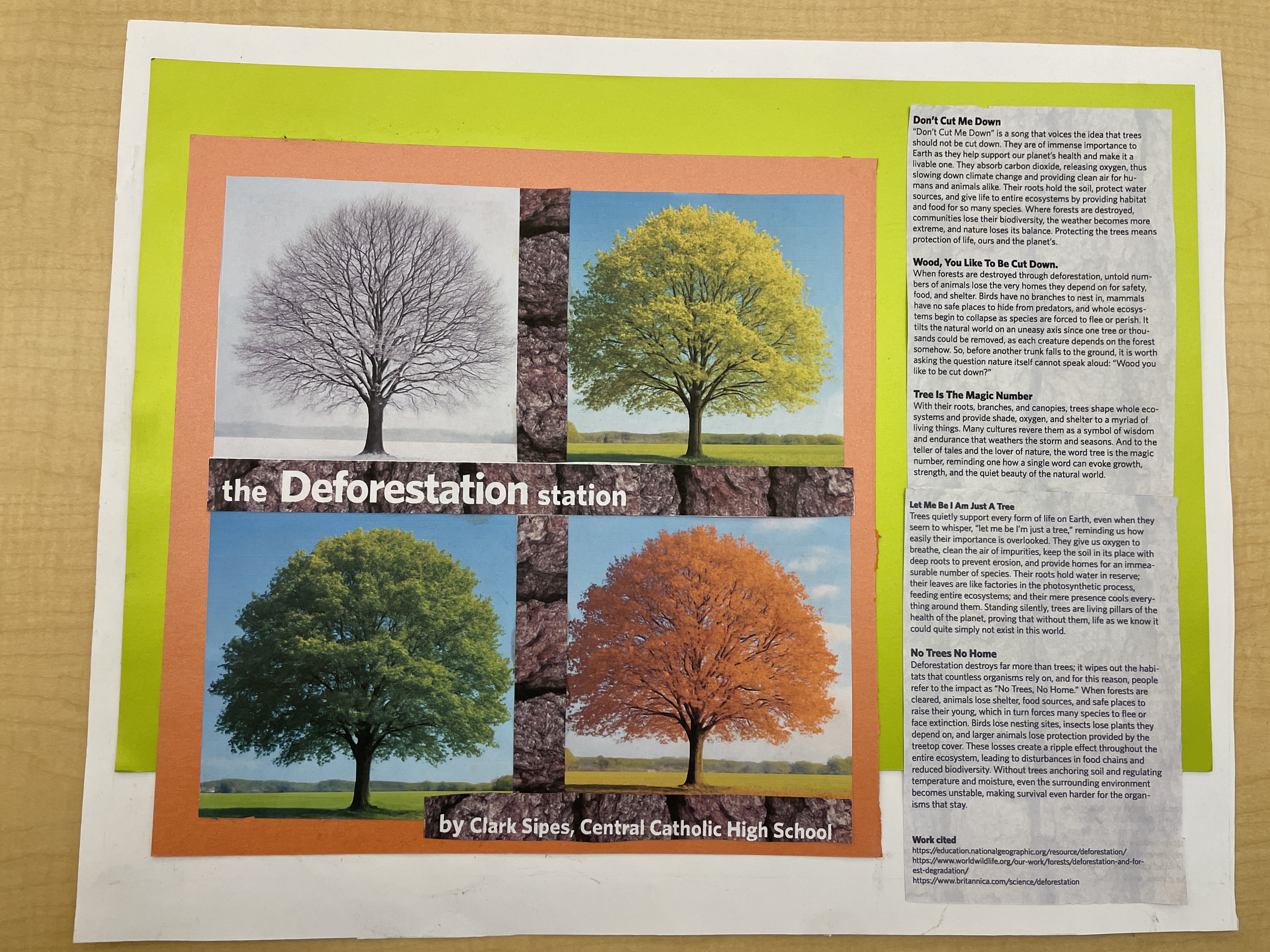 High School Challenge 2: Playlist for Peace was created to showcase how we can communicate about climate change through a variety of mediums, including art and music. In this challenge, students stepped into the role of musician-activists, blending art, storytelling, and environmental awareness into powerful original “records.” They designed striking 2D album covers and curated five-song track lists centered on issues they care deeply about—from climate change and ocean pollution to environmental justice and eco-anxiety—using music as a lens to explore and communicate complex ideas. Each song was thoughtfully explained to show how it connected to their chosen theme, and some students even went a step further by recording original tracks. With guidance and encouragement from dedicated educators, students demonstrated creativity, critical thinking, and courage, proving that music and visual art can be meaningful tools for inspiring dialogue, empathy, and action for our planet. Artwork from this challenge id currently on display in the Center for Sustainable Landscapes Gallery.