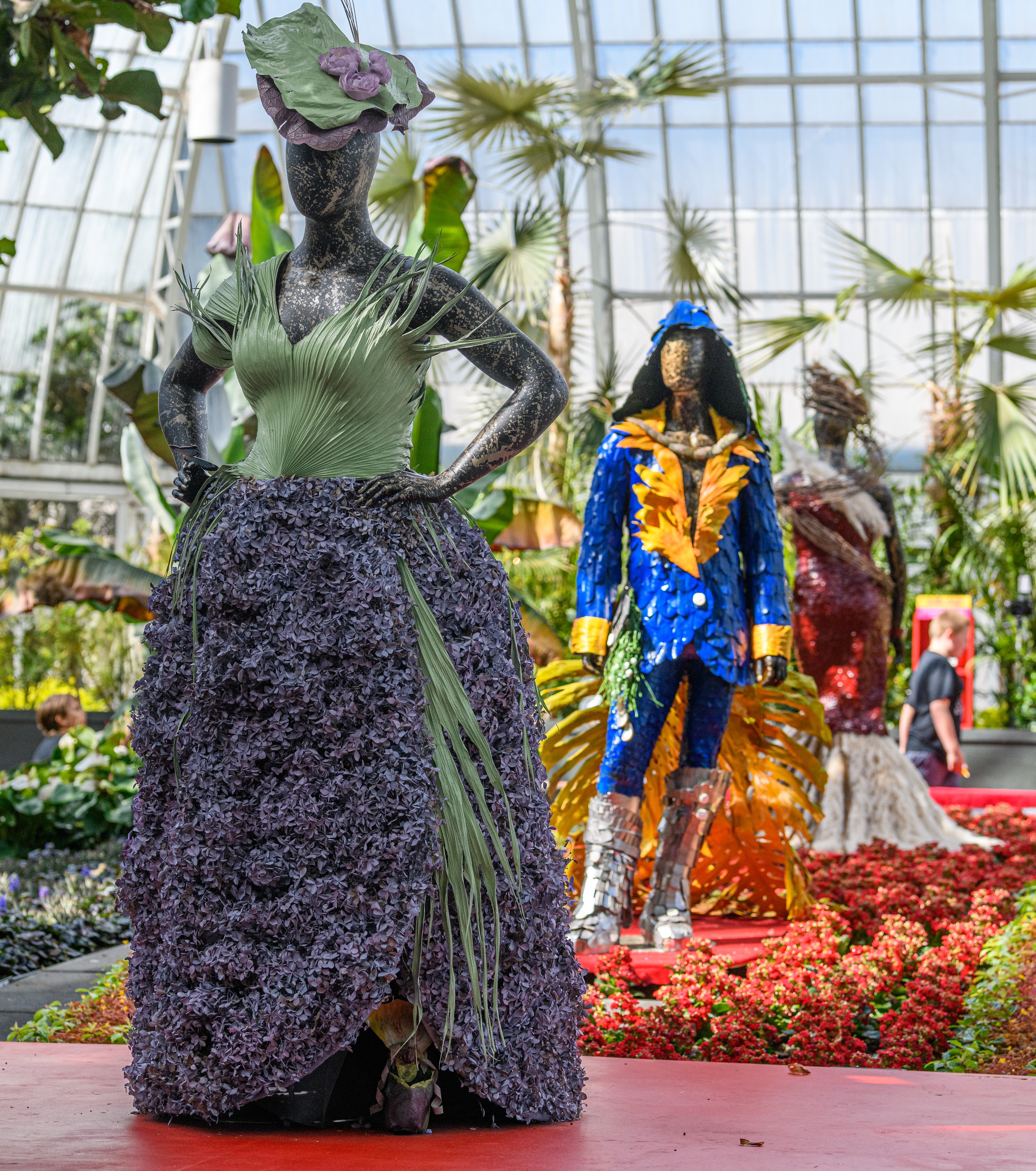 Guests spent the summer being wowed by our glasshouse full of fabulous fashions! Many of the designs were created by local designers and students from Billy Porter’s alma maters, CMU and CAPA high school in Pittsburgh. Aside from these, four creations came from the hard work and creativity of Phipps staff. These pieces use materials found in the conservatory, promoting the ideals of repurposing, innovative gardening practices and sustainable fashion!