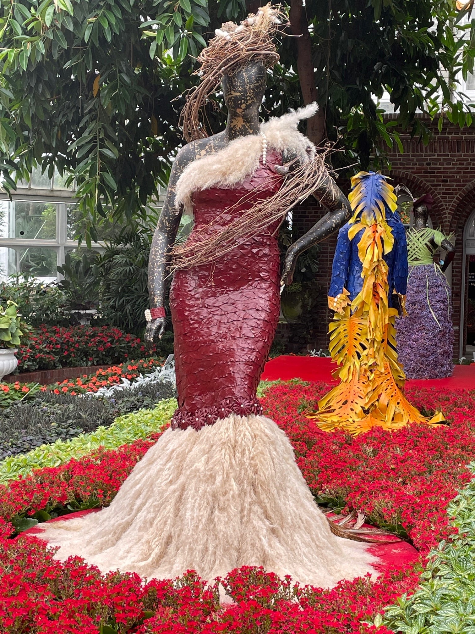 In the South Conservatory amid a runway of radiant red flowers, there are three topiaries designed and constructed by the horticulture staff at Phipps. The process began with a brainstorming session including Associate Director of Exhibits Jordyn Melino, Exhibit Associate Mary Lou Linton-Morningstar and no less than four of our gifted horticulturists. The group began by choosing different dried plant materials to use in construction. Inspired by their materials, the group landed on the theme of nature with each of the topiaries representing an aspect of nature: earth, water and air. To make each piece beautifully unique, they decided to vary the silhouettes on each figure: a fitted dress, a full ball gown and a suit. The group effort has proven successful as guests continue to marvel at each piece rocking the runway!
