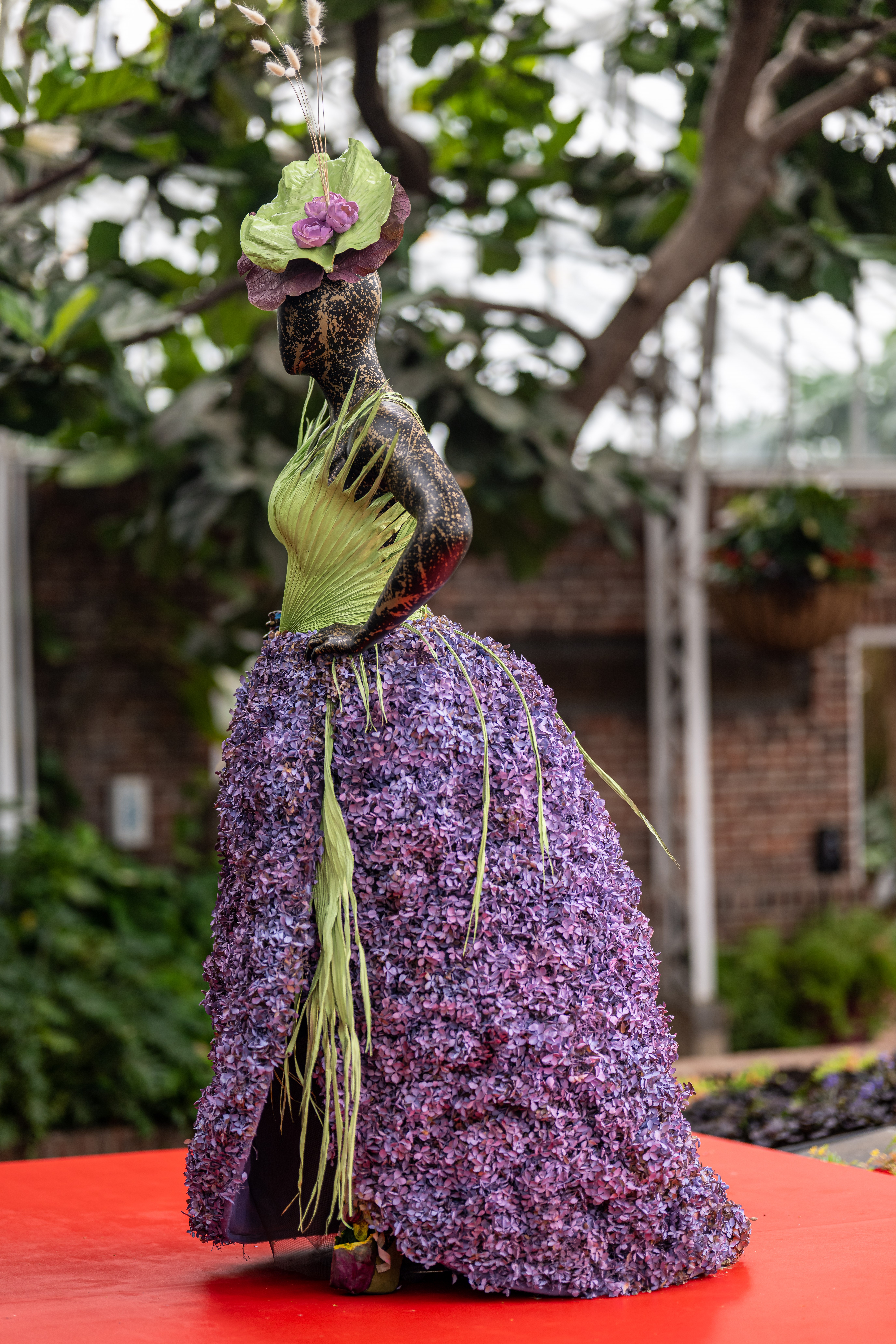 Constructing with plant materials can be challenging, especially with the warm and humid summer conditions. It took horticulture staff, Mary Lou Linton-Morningstar, Abby Anderson, Laura Schoch and Cat Waddington, four months to complete the construction of the pieces. During the process they had to be adaptable with their designs. For instance, “Hort Couture,” the full ball gown, was originally planned to have a high collar using the palm fronds, however as they worked with the plant material, they realized that the bodice should hug the mannequin creating a stunning breast plate with woven fronds in the back to add a sophisticated touch. This is the first gown that you see as you enter the South Conservatory, representing the earth. It is comprised of dried plant materials in gorgeous shades of purple and green. The skirt is dried hydrangea heads, the bodice is made of woven palm fronds as well as a variety of other plant materials to create a full and fancy ball gown.