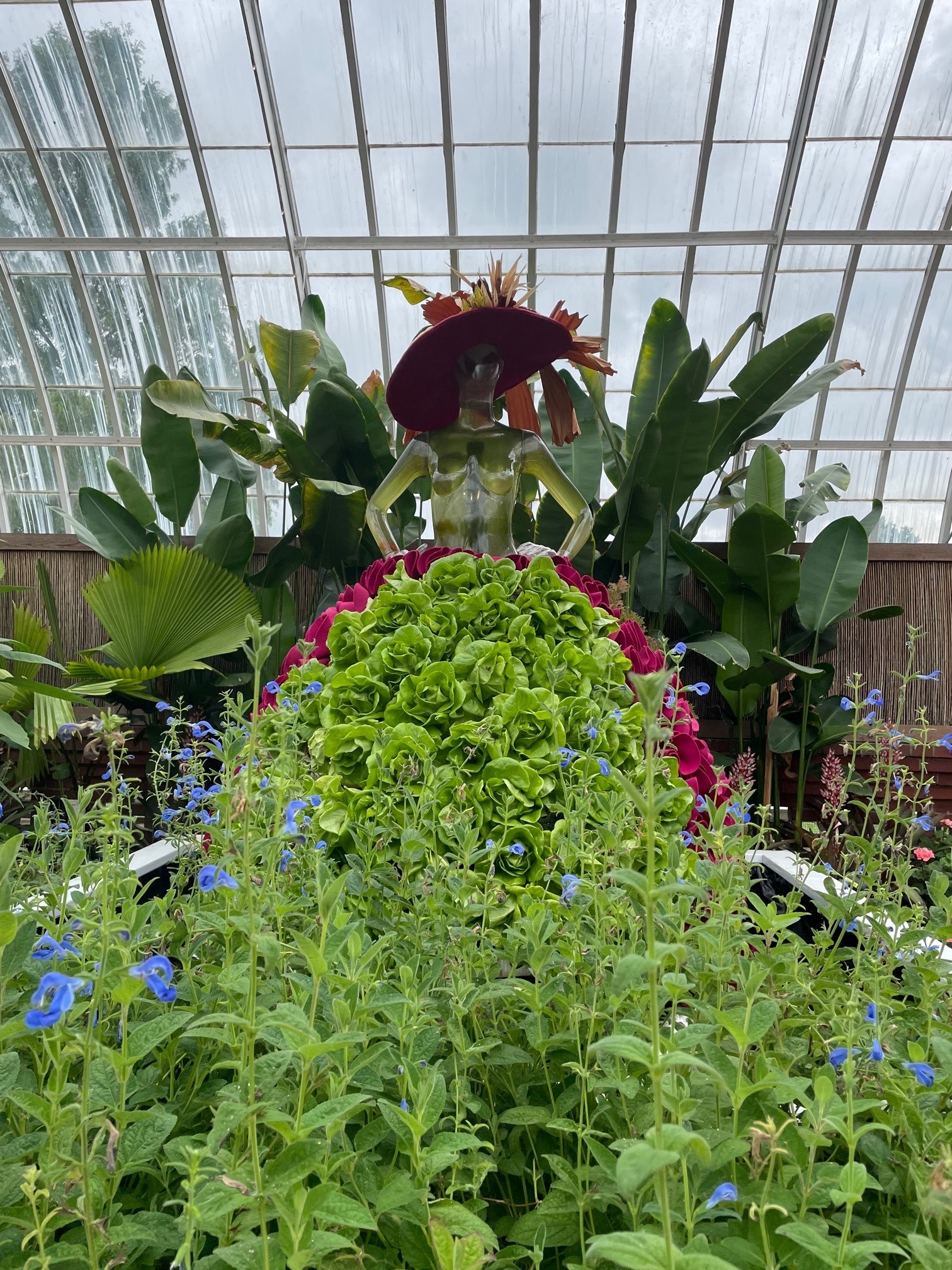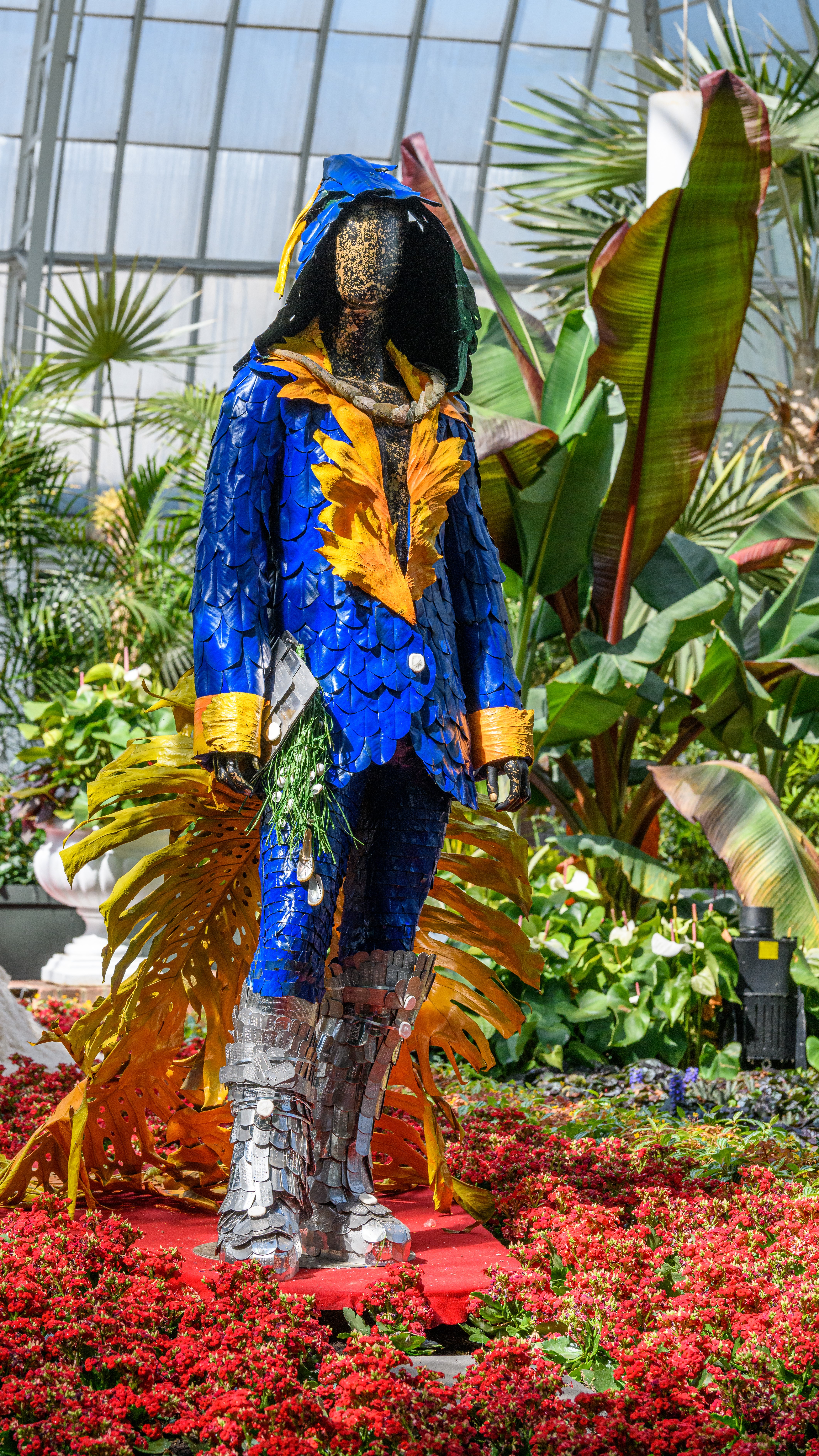 “Swim Suit” is the title of the middle design, representing the element of water. The dapper suit is constructed using magnolia leaves, staghorn ferns as well as other plant materials. Influenced by colorful tetra fish, bright yellow swiss cheese plant leaves trail off the back, resembling a fish tail. The design also incorporates other items found at the conservatory; the boots are made of upcycled plant ID tags, which proved challenging as “the extended periods of heat made it difficult to maintain the boot structure,” said Mary Lou.