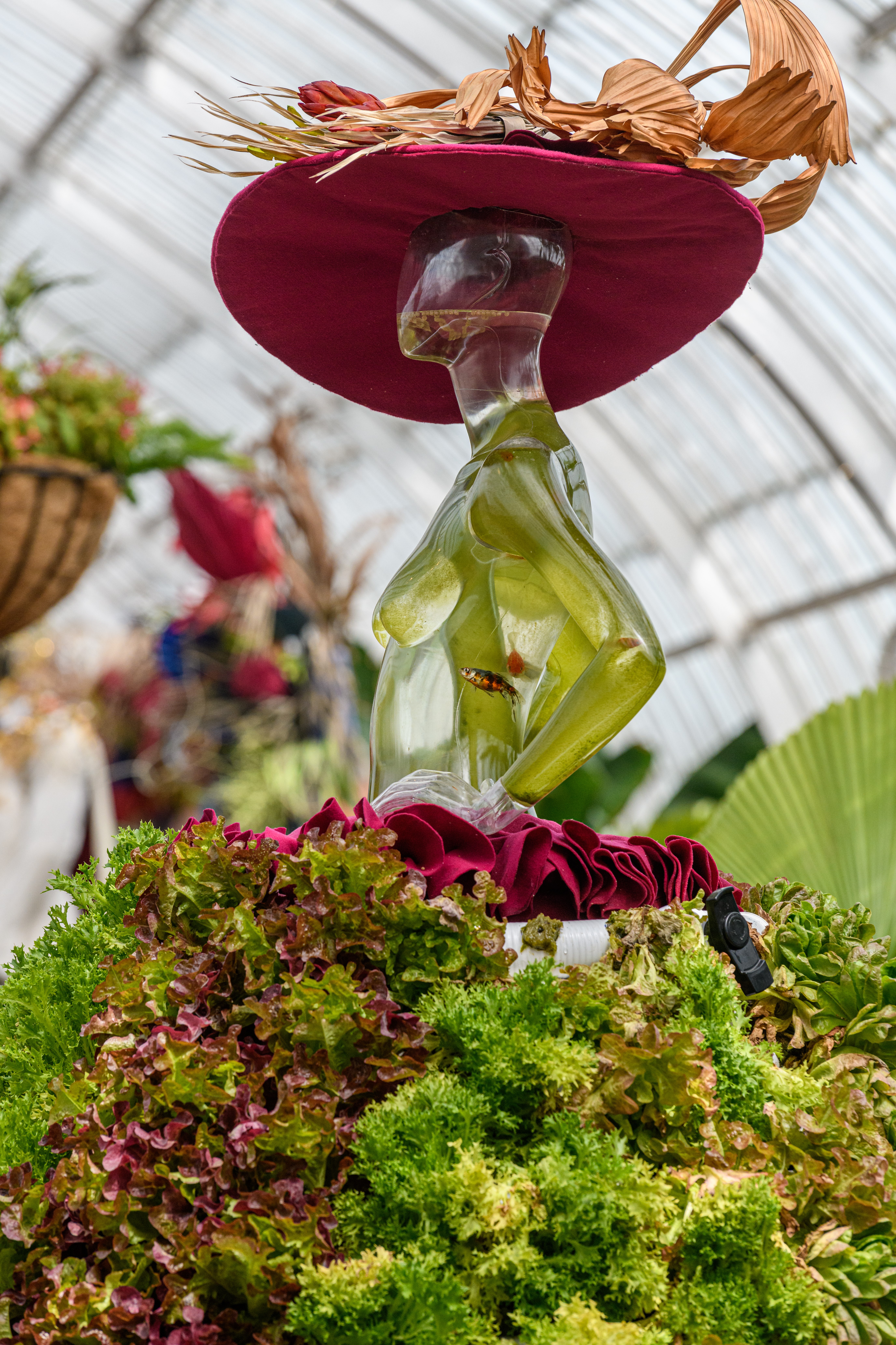 Another Phipps original is featured in the Serpentine Room, the living star of the show is called “Salad Dressing.” This high fashion wonder is an actual living garden! The display is a working hydroponics system, complete with a living lettuce skirt and fish swimming about. Hydroponics allow plants to grow in circulating water with nutrients that the plants need while using 10% less water than growing in soil. This display is art but when used for food production the lack of soil also means no weeds and very few pests on the vegetation, making it an efficient and ecologically sound form of farming. “Salad Dressing” was the idea of our Director of Facilities Peter Thompson, who wanted to contribute a unique creation that showcased Phipps commitment to sustainability.