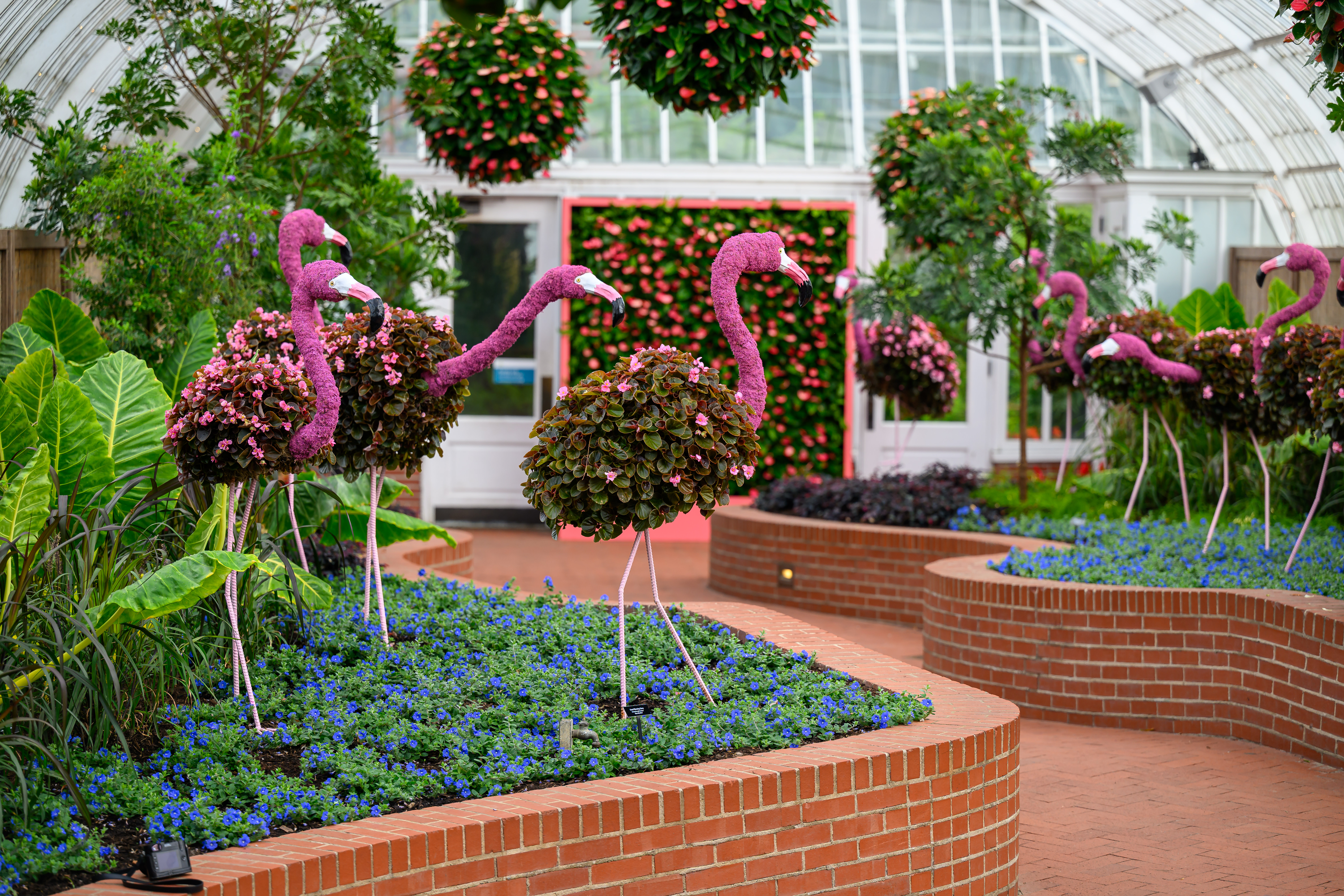 In our Serpentine Room, you’ll find 15 pretty pink flamingos roaming throughout the room in varying poses. Although our talented Phipps staff can make a variety of topiary animals, they decided to call our friends at Franklin Park Conservatory in Columbus, Ohio for a loan! Back in March, Phipps staff picked up the painted flamingos from Franklin Park and then planted them with begonias when they arrived at the Conservatory. Throughout the duration of the show, horticulture staff must prune and deadhead the begonias to keep them looking fresh all summer long. In case any of the plants need to be replaced, there are backups in the Production Greenhouses that will ensure the flamingos stay in tip-top shape, maintaining their beautiful vibrancy!