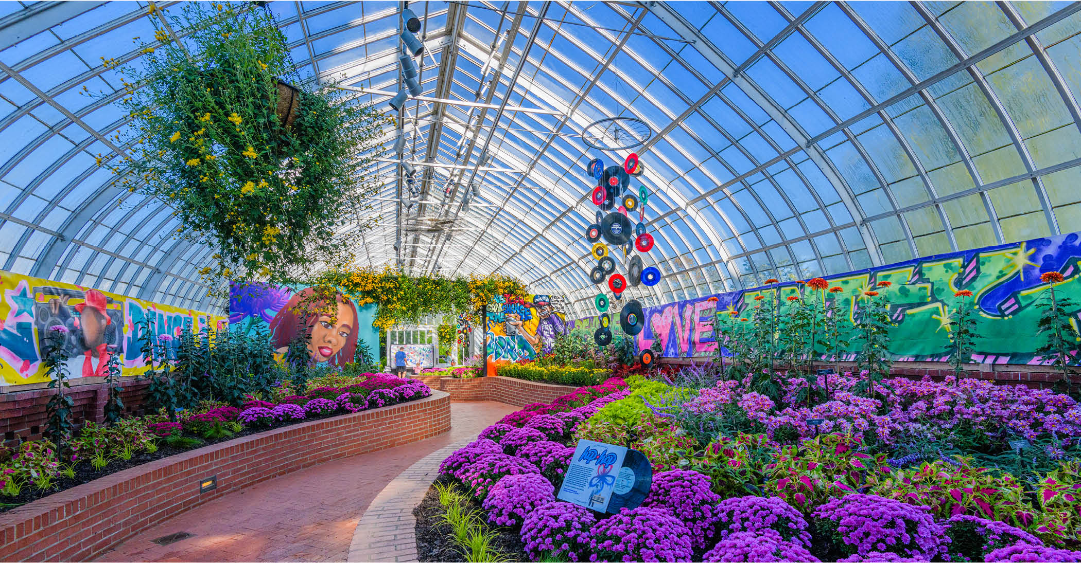 As you walk through the Serpentine Room, you’ll be tempted to bounce to the music while admiring the myriads of colors and patterns – both in the flower beds and the one-of-a-kind- graffiti panels.