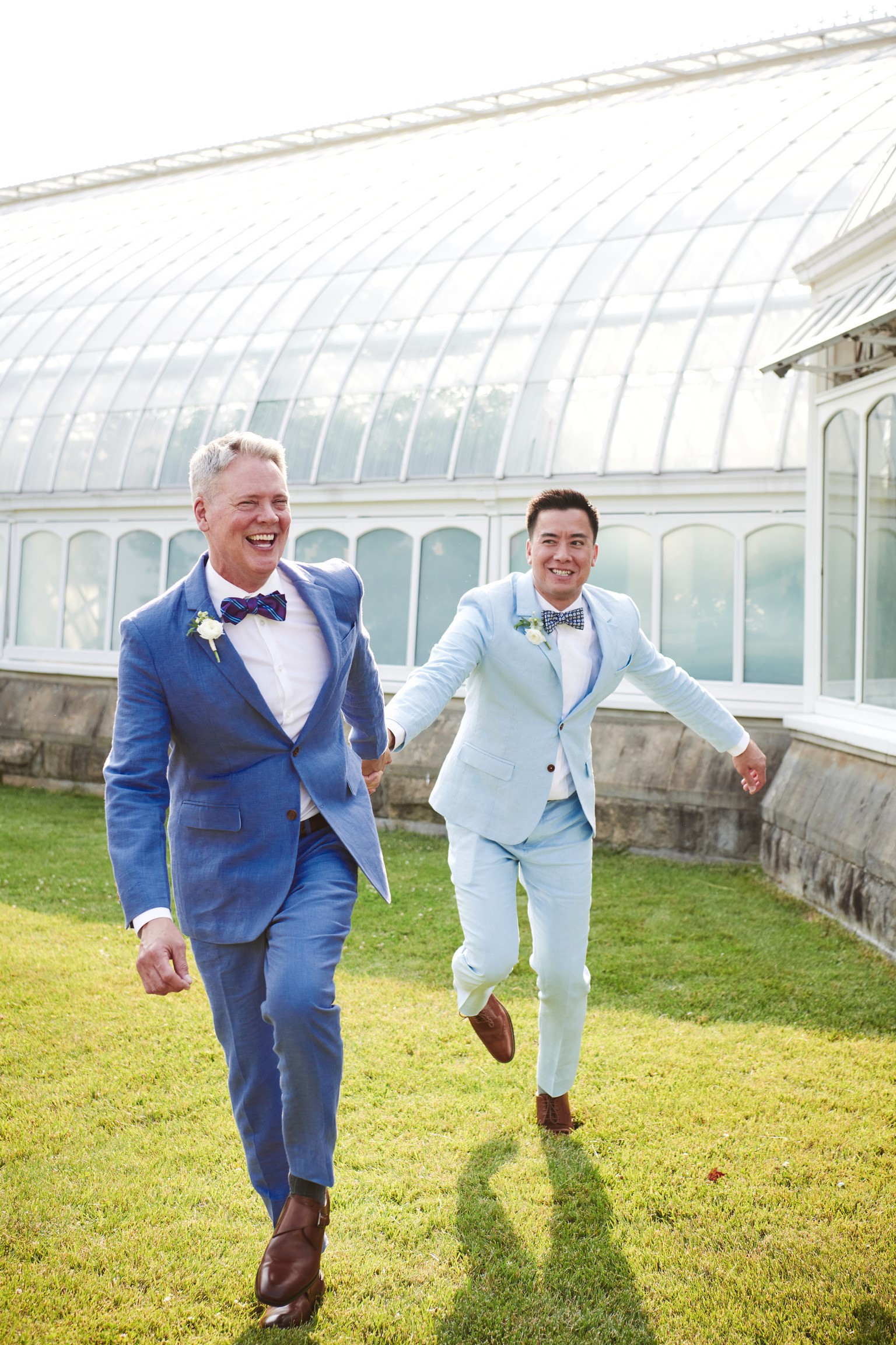 The couple’s favorite part about getting married at Phipps was that “Our wedding coincided with the Phipps Billy Porter fashion exhibition, which was perfect for a queer couple that includes a fashion designer.” In fact, their flowers designed by local florist Bramble and Blossom, were displayed as dresses on two of the dress forms from Mikes studio. They had Michael Marquez, a fashion photographer and the husband of Mike’s “best person”, photograph the wedding. Another friend from Jersey City, Paul Mendoza, was their DJ, “mixing in lots of 80’s classics”. Although it was the first wedding experience for both the DJ and the photographer, the grooms thought they were fantastic!