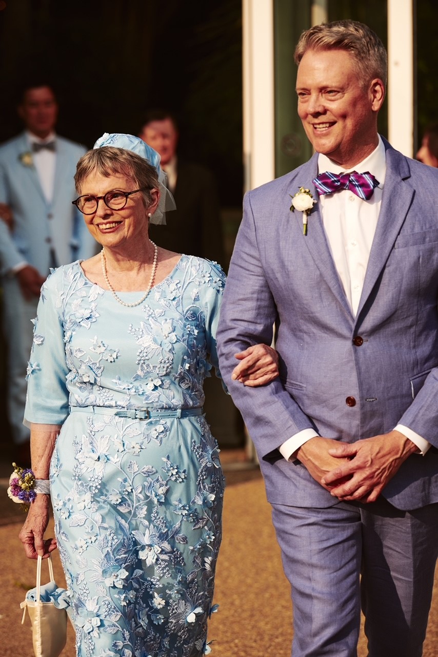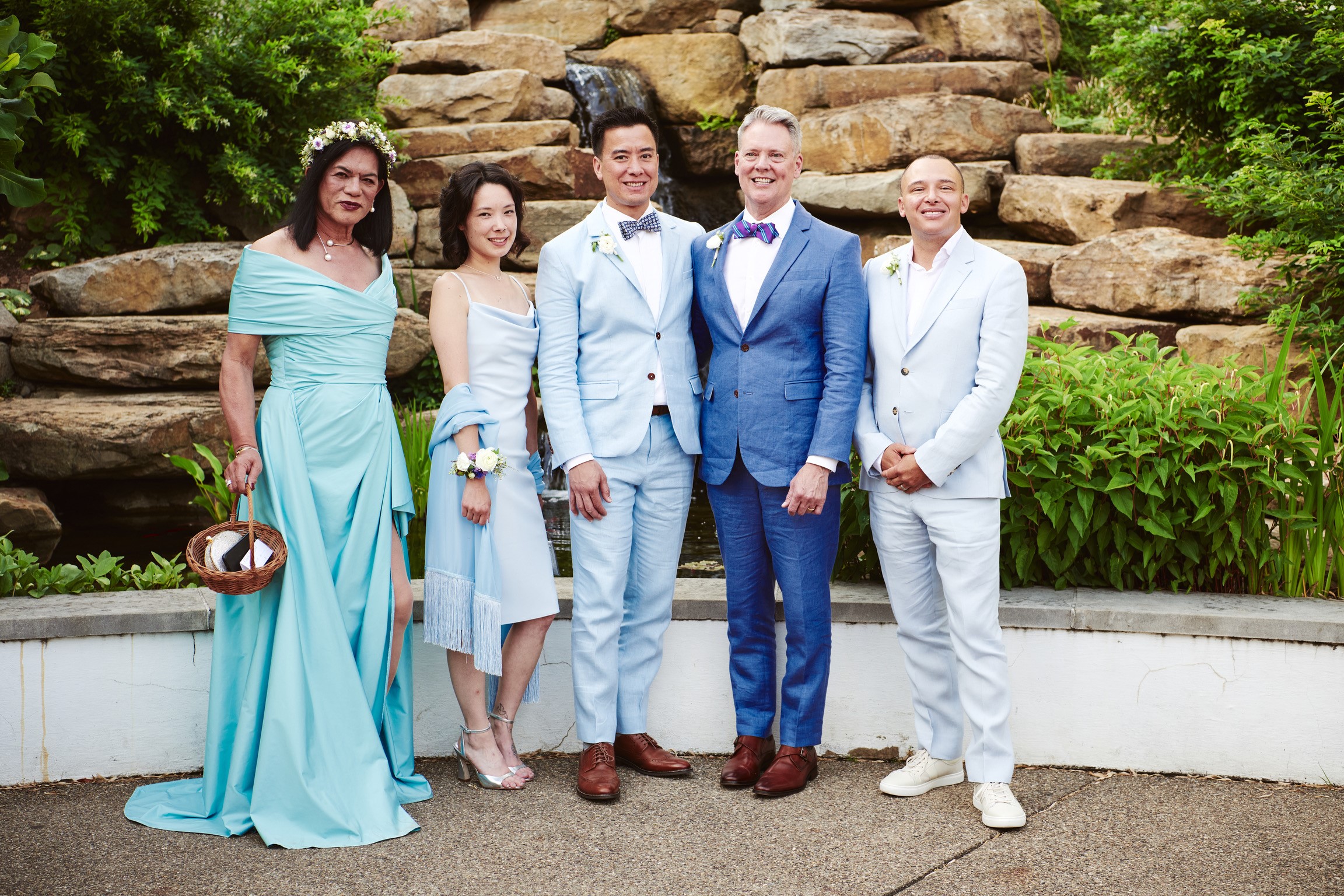David and Mike were married on June 17th, 2023, in front of the waterfall outside the Tropical Forest, followed by a reception in the Special Events Hall. Mike took the lead on the design of the wedding, choosing white and light blue as their colors. Mike designed linen suits for the grooms, as well as looks for all the ladies in the wedding party! To showcase all the amazing ensembles Mike created for the occasion they fittingly included a runway walk at their reception, at which the guests showed their approval with “many hoots and hollers.”