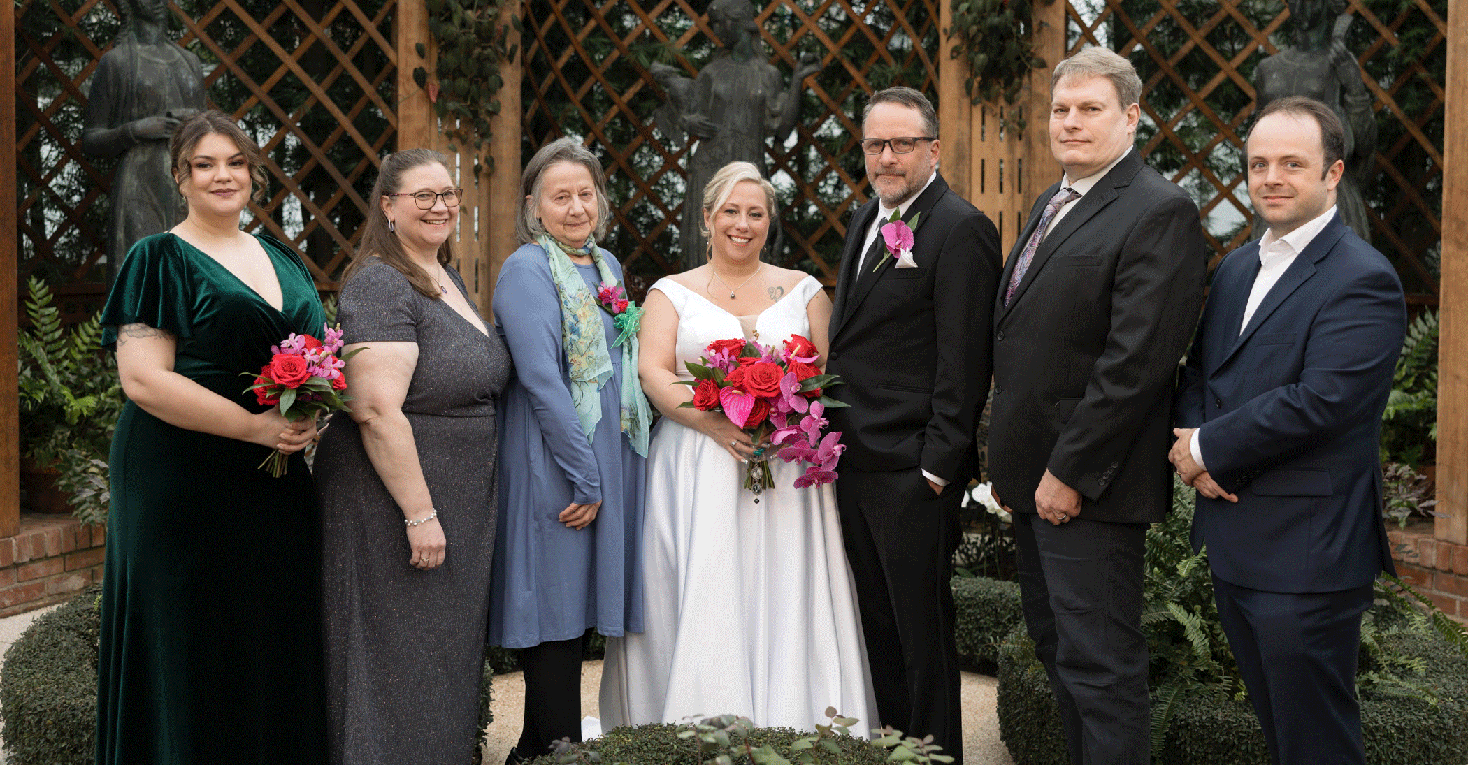 Marissa and Dan were married in the Broderie Room on January 30th. They wanted a simple wedding to allow the beauty of the venue to shine. They chose emerald green and fuchsia as their colors. Orchids were the focal flower in their arrangements which coordinated well with the Orchid and Bonsai show taking place throughout the Conservatory. They had a small intimate wedding with Dan’s son as the best man and Marissa’s niece as the maid of honor. They included memorial chairs with plaques and small white floral arrangements for their parents to include their memories in the ceremony. Just prior to the ceremony, Dan suggested that they walk down the aisle together so they could start their marriage “the way we are in our relationship, as partners.”