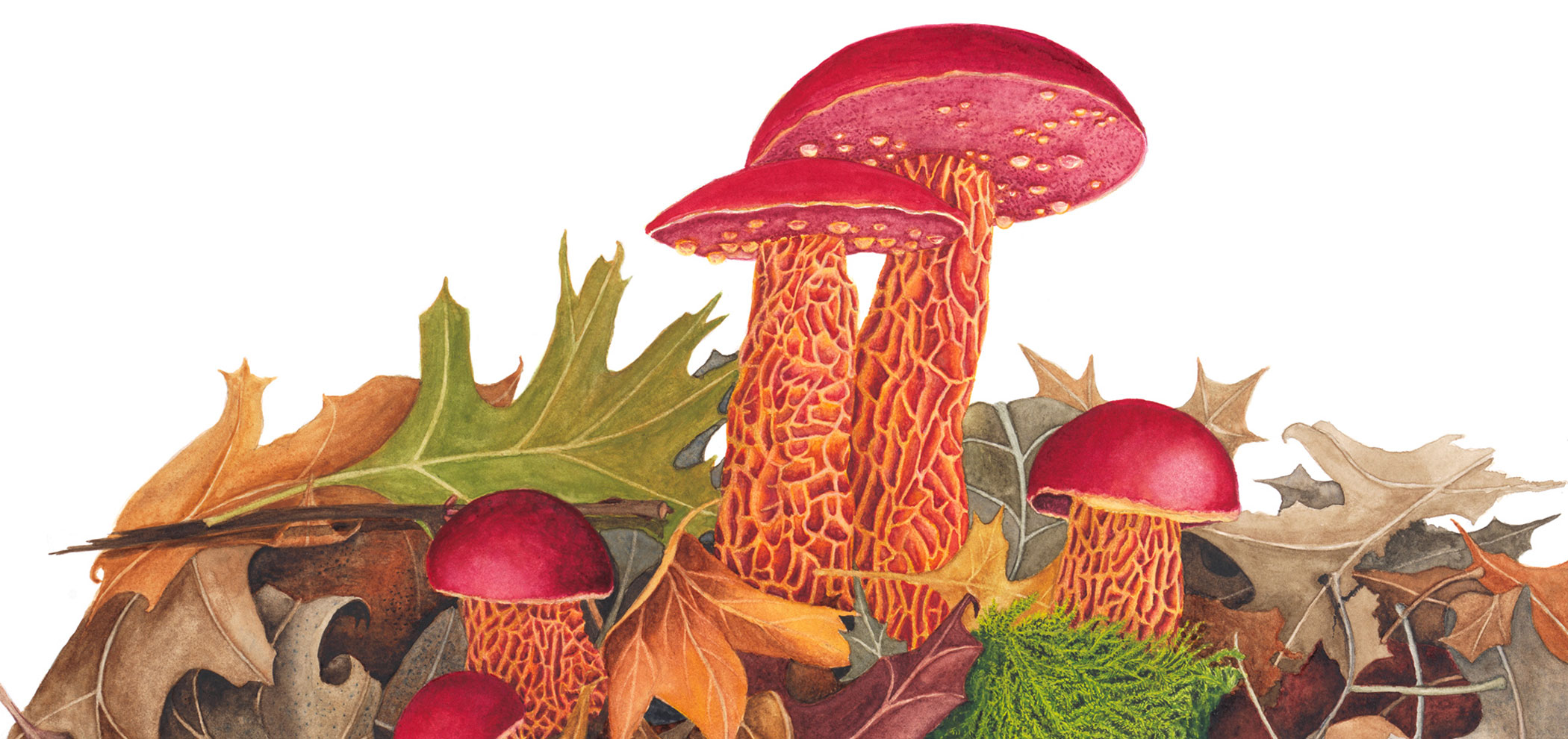 Candy apple bolete mushrooms (Buytyriboletus frostii), watercolor, illustration by Lisa Rassmussen