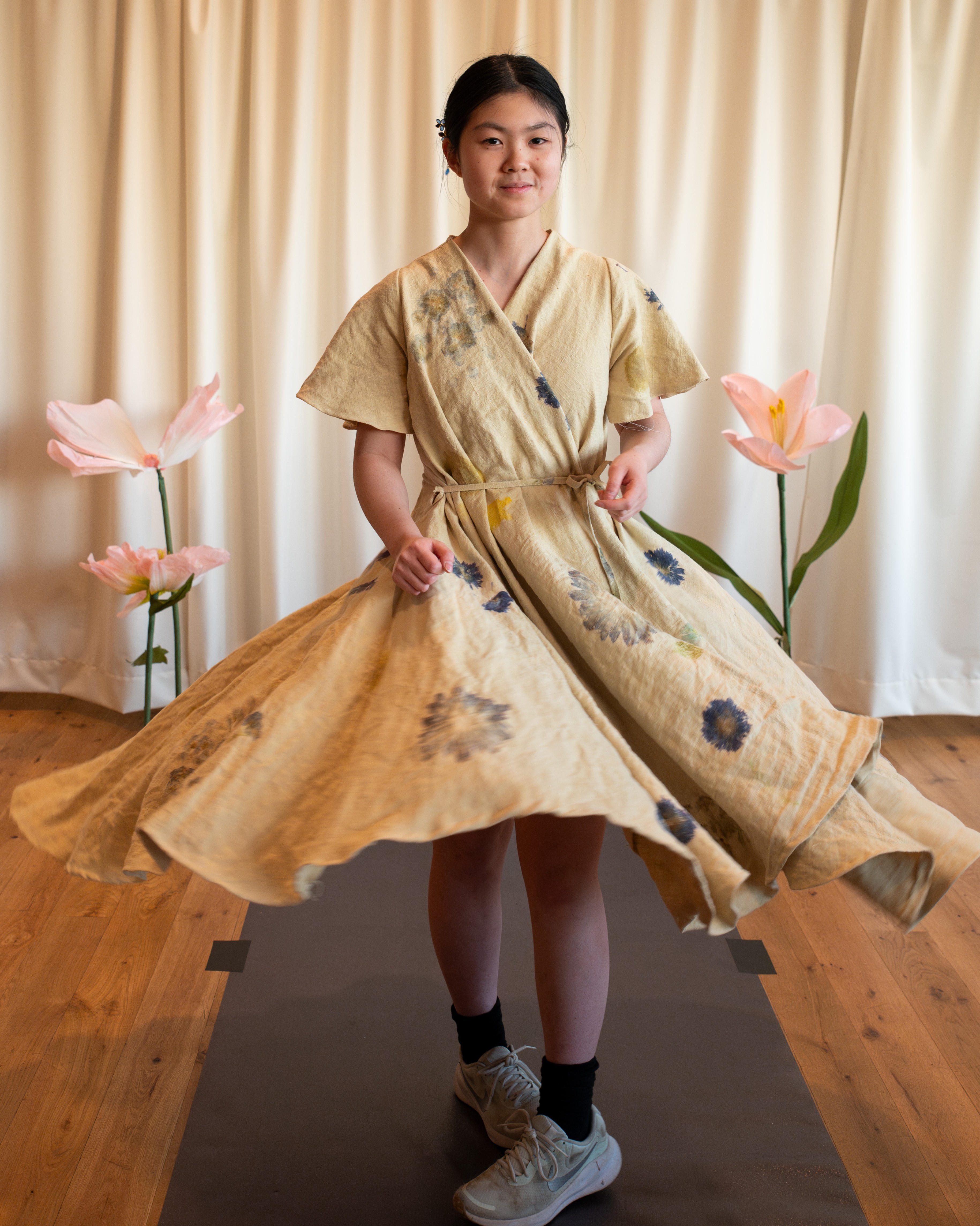 Jessica Wu, Painting with Phipps Flowers: This dress showcases the art of flower pounding, where Jessica transferred the vibrant pigments of flowers collected from Phipps Conservatory onto fabric sourced from a creative reuse center. Jessica wants to be sure to give a big thanks to the Phipps team who provided the flowers, especially Jess Horenstein who showed patience and support.