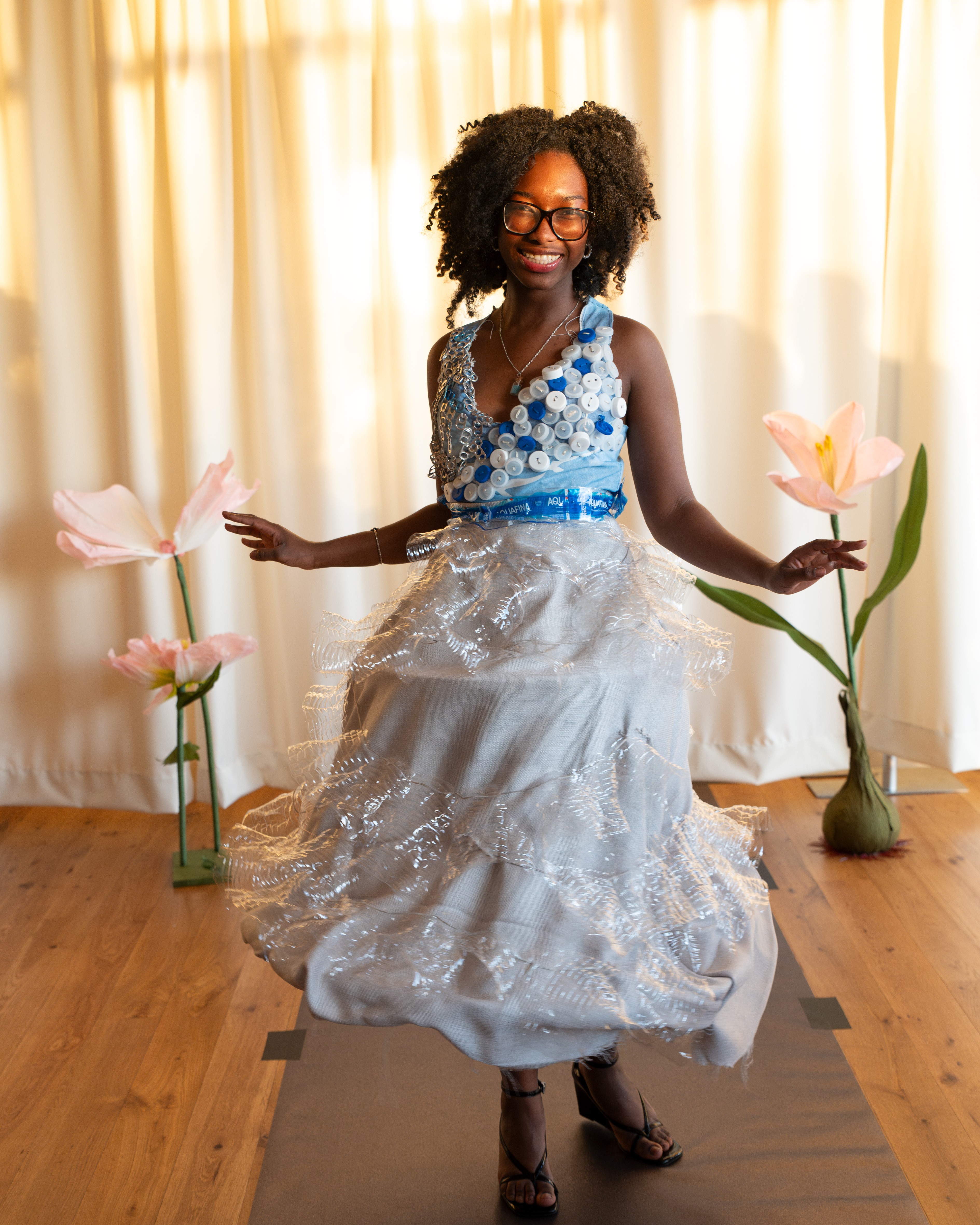Khyronessa Avotri, Waters Plastic Ripple: Khyronessa was born in a city bordered by beautiful beaches and has always had a deep love for the ocean. Her piece encourages us to reflect on our impact on the environment with each ripple of the dress symbolizing the beauty of our oceans and the pollution they face. Her classmates collected over 100 water bottles, which her mother helped cut, and Agnes Bitz donated the aluminum can tabs. Khyronessa’s goal was to minimize waste and create an example of how we can make a difference.