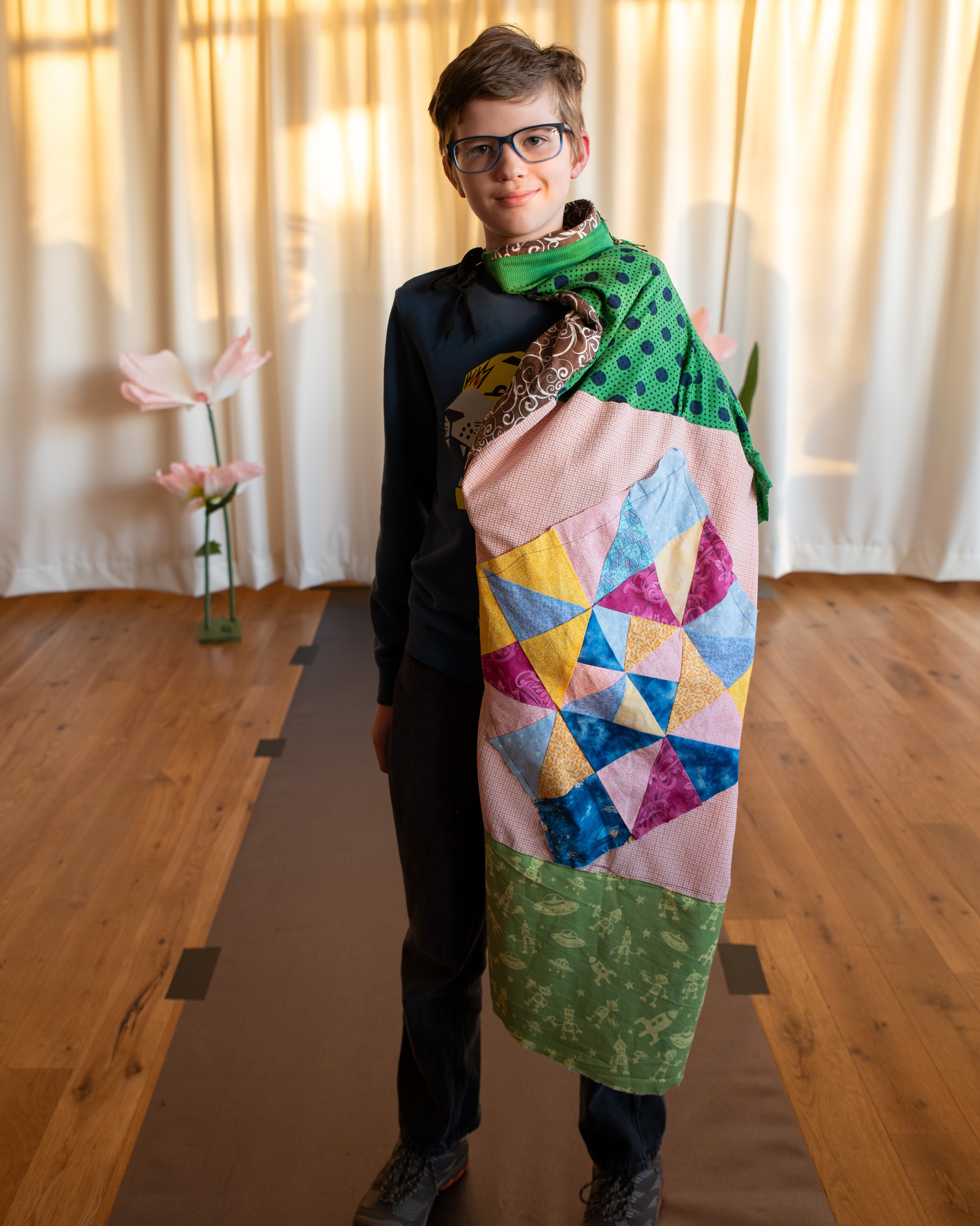 Oscar Schneider, Rainbow Cape: This cape represents not only sustainability but also family bonds. It was Inspired by the vibrant colors and patterns around Ozzie with multiple pieces of previously worn clothing and fabric scraps used to bring this vision to life. Towards the bottom of the cape, you'll find fabric featuring rockets and space robots, leftovers from the crib skirt his grandma made for Ozzie’s birth. With the help of Grandma Linda Pretz, Ozzie was able to connect with family and present the “Rainbow Cape”.