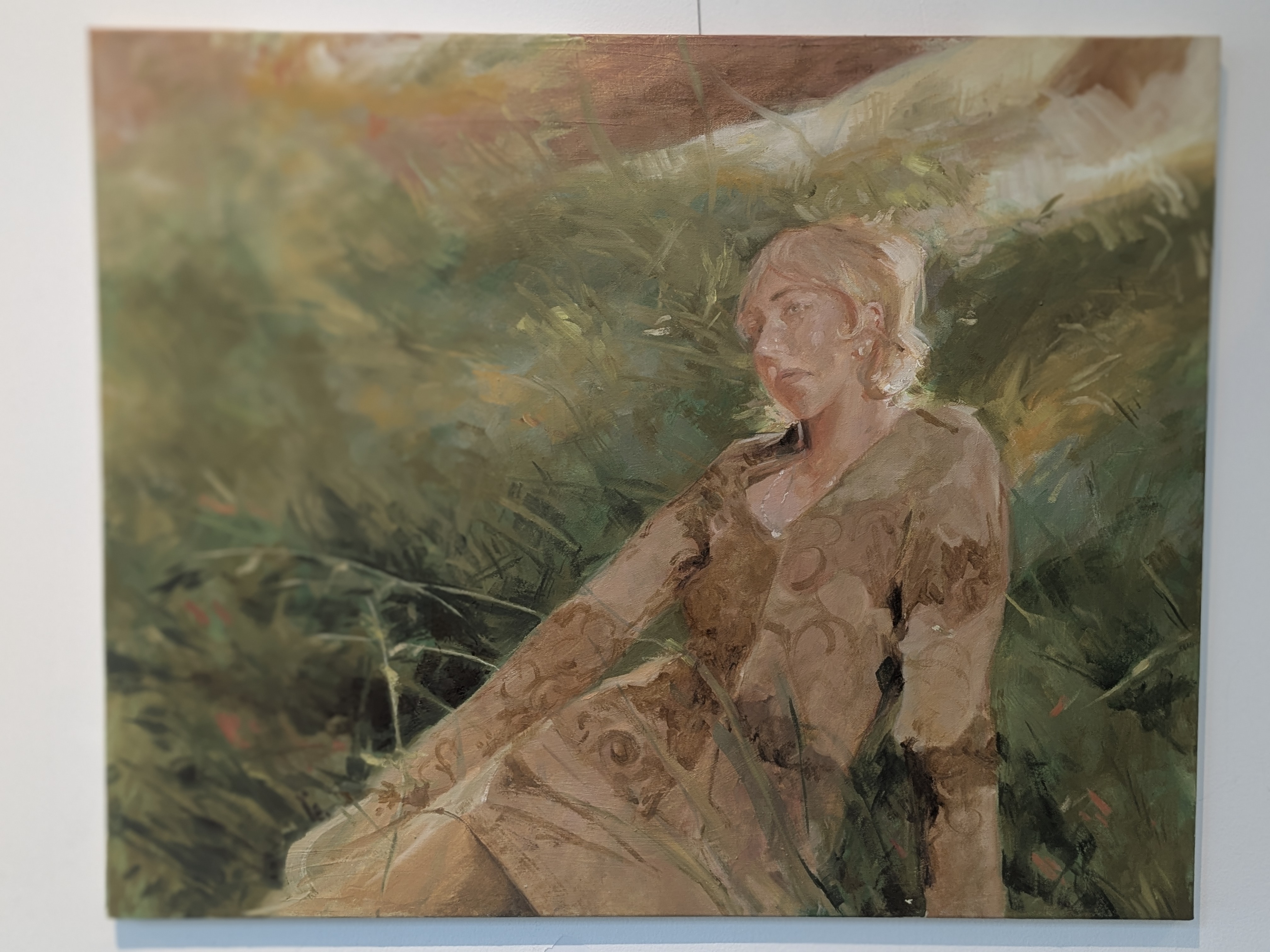 Suanna Zhong, Katya: In an effort to recreate the solace found in natural phenomena and the nostalgia growing up in California, Suanna rendered this painting from a photograph of dear friend, Katya, in a field located in Mount Tamalpais, California.
