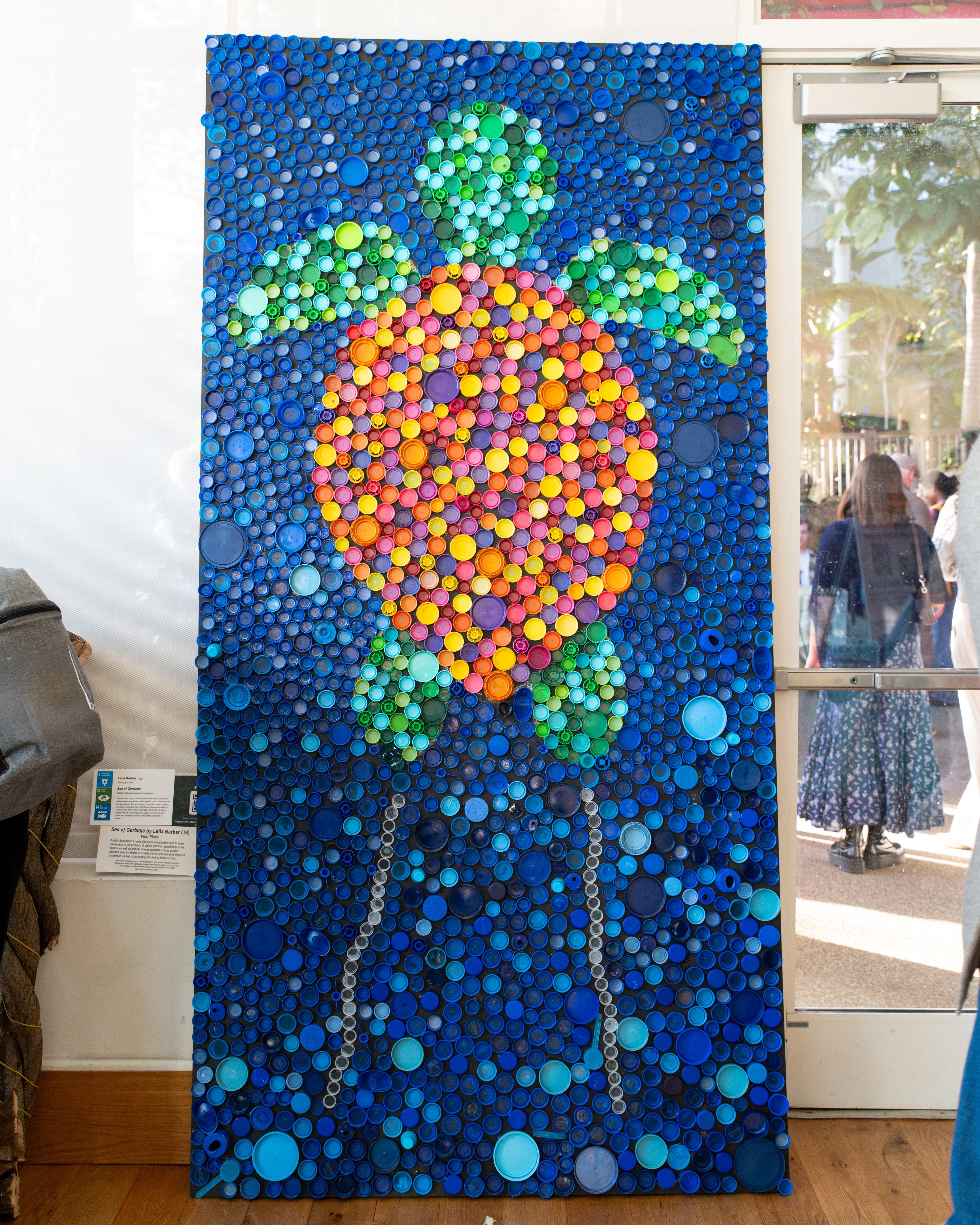 Leila Barber, Sea of Garbage: Created with over 2,000 recycled bottle caps, this piece raises awareness about plastic pollution and its impact on climate change. By repurposing discarded caps, it gives new life to materials that might have otherwise ended up in the ocean. This work encourages others to transform waste into art, inspiring action against environmental harm and fostering a more sustainable approach to waste.