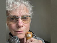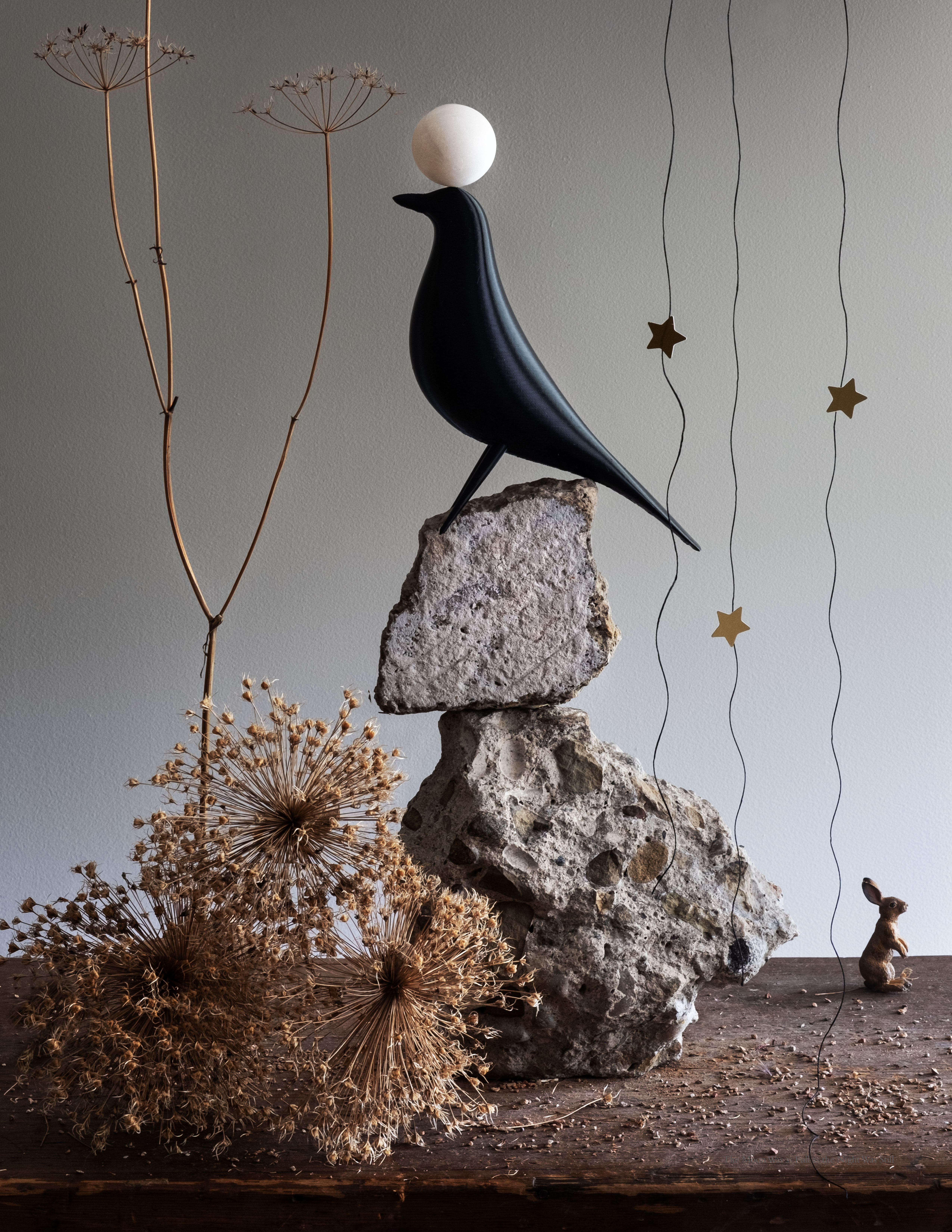 "My stage is a piece of wood, the top of an old tool chest, 14” wide, 35” long, and just an inch high. It sits on a pedestal close to a window that gets filtered, rarely direct, light. Rocks, pigs, balls, flowers, binder clips, an occasional grape tomato, and other miscellaneous things that I collected through the years, recently ordered on Ebay and/or picked up on the street, are my actors. They’re also my friends. I bond less with the perfectly manufactured binder clips, but the other creatures and objects, and especially the rocks, have spirits that I respond to. Many have endeared themselves to me—I love the dog with half a tail; I still feel sorry for the bunny that is missing a leg; and for whatever reason, I talk to the pigs. They are my perfect, imperfect collaborators with whom I create stories of innocence, joy, affectation, impending doom, hope, as well as of other conditions that I see and partake in. Implicit in this work are my values and some commentary about the world in which I live and the world I would like to inhabit. I started this series shortly before the COVID pandemic in 2019 and I continue it today. As the world is shaken by wars and natural disasters–and interrupted by some glimmering good things, too–I go up to the studio on the third floor of my home, and with my “little friends” try to make sense of it."