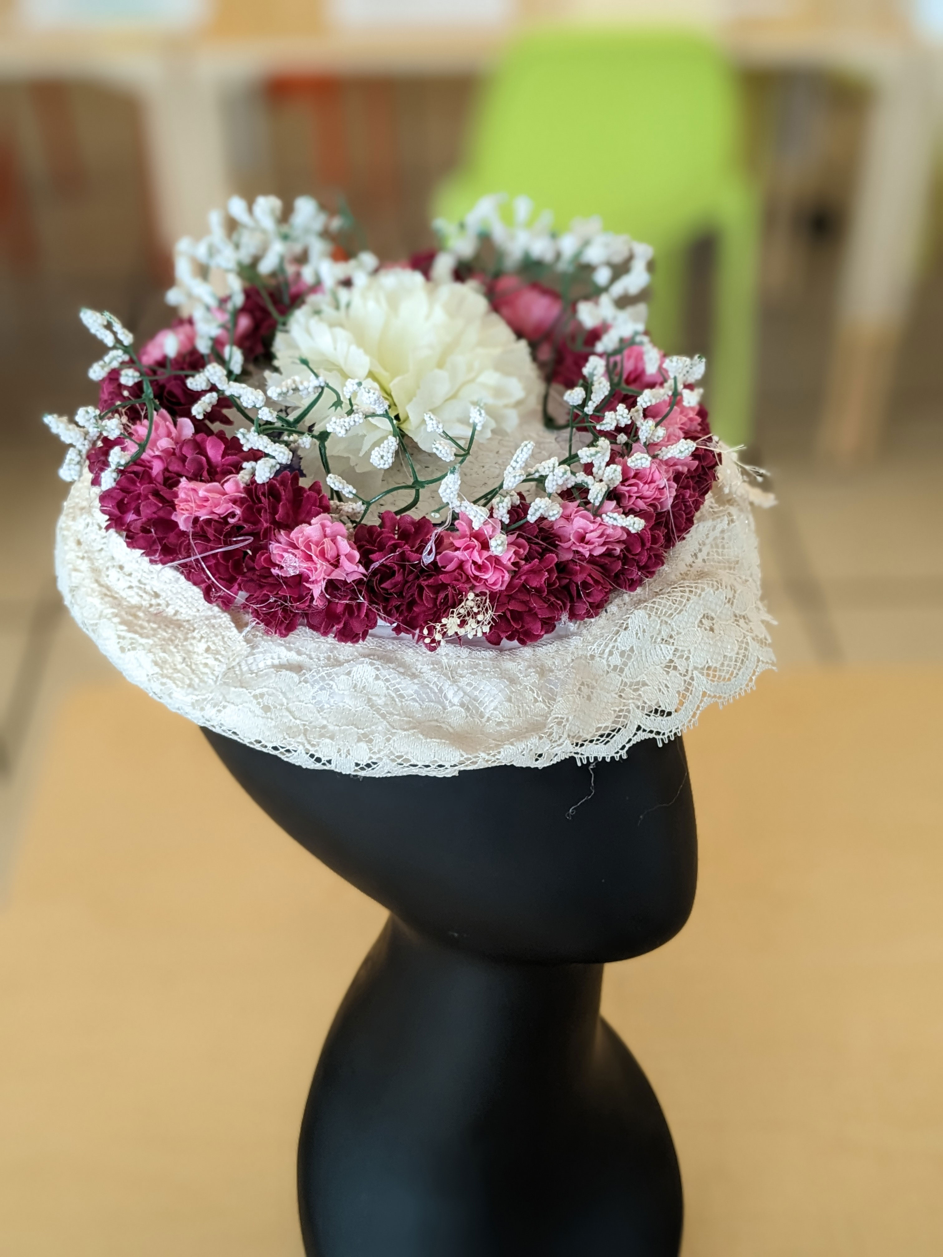 "My inspiration for the hat was to show how there is happiness and there is sadness. That's why there is a blank side and a side full of flowers on my hat."