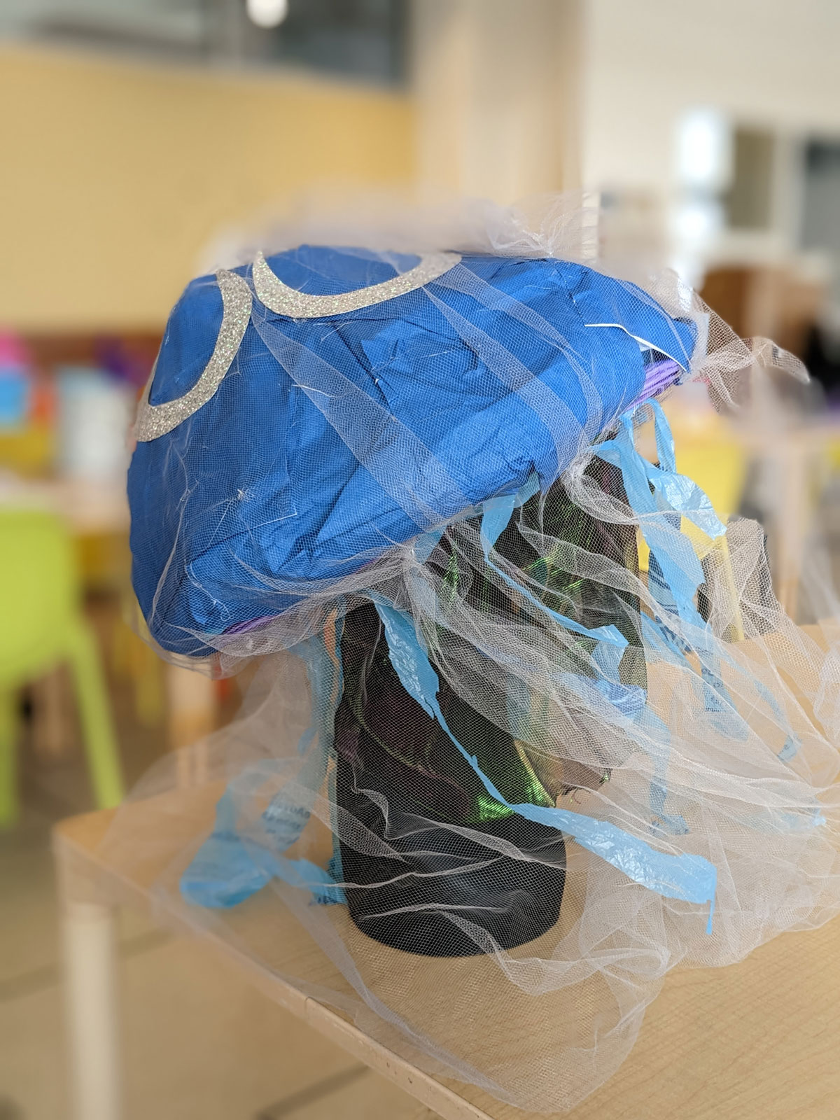 "Seeing dangling objects from hats, tall brims, and the general shape of most sun hats gave me the idea to create a jellyfish hat."