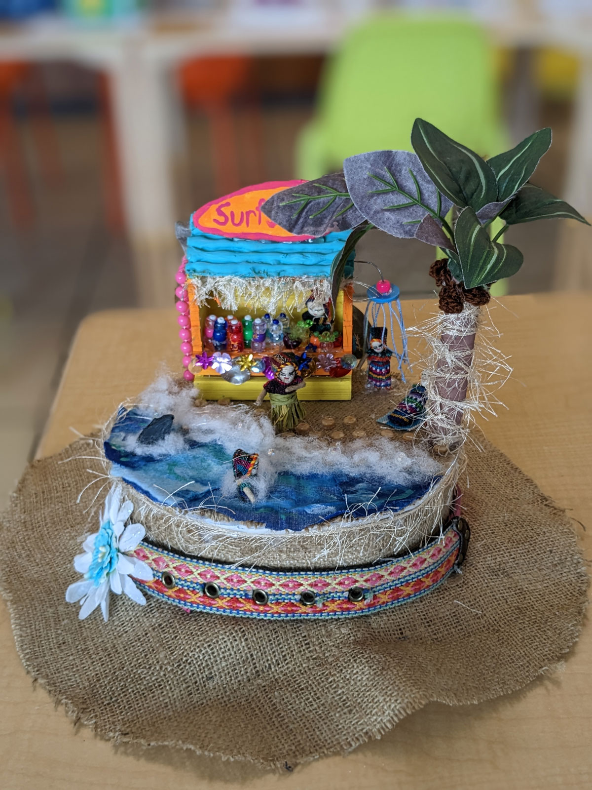 "The inspiration for our hat is a warm, sunny beach day. For our hat we created the “Surf Shack” which has water and soda bottles made from beads of a variety of colors."