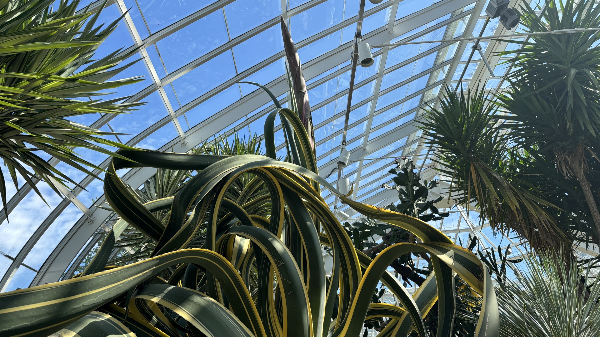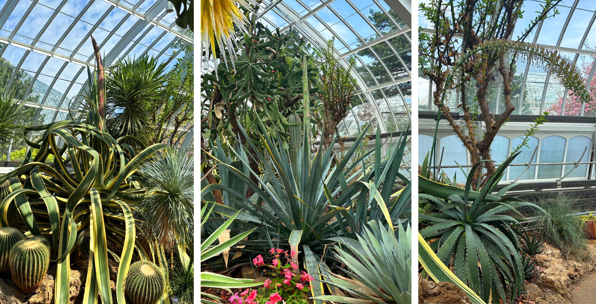 Agaves belong to the asparagus family, a connection made evident by the shape of their towering blooms. These massive flower spikes, often resembling giant asparagus spears, can grow rapidly, followed by a flowering display lasting about a month. Although agaves flower only once, they ensure their legacy by producing “pups,” or offshoots, which are already visible around each plant. Following the completion of the bloom cycle, the agaves will be replaced with new desert specimens as part of Phipps’ ongoing display evolution.