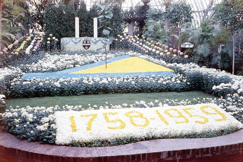 1958 and 1959 saw additional Conservatory collaborations with Pittsburgh artists: The Bonsai Club presented its first exhibit at Phipps alongside Spring Flower Show.46 Bonsai plants are now regular installations in the Gallery Room and Tropical Fruit and Spice Room and are showcased in the annual Orchid and Tropical Bonsai Show. In the following year, Phipps celebrated Pittsburgh’s bicentennial anniversary with the display of a bicentennial seal formed entirely out of chrysanthemums and a two-day exhibition from the Western Pennsylvania Orchid Society.47