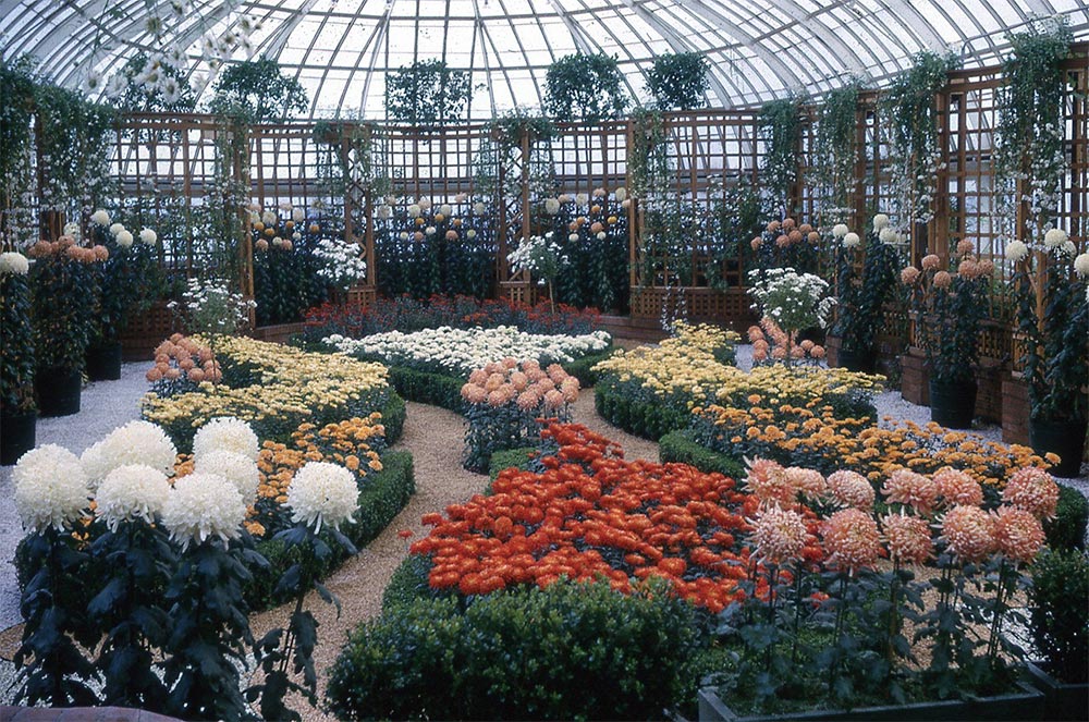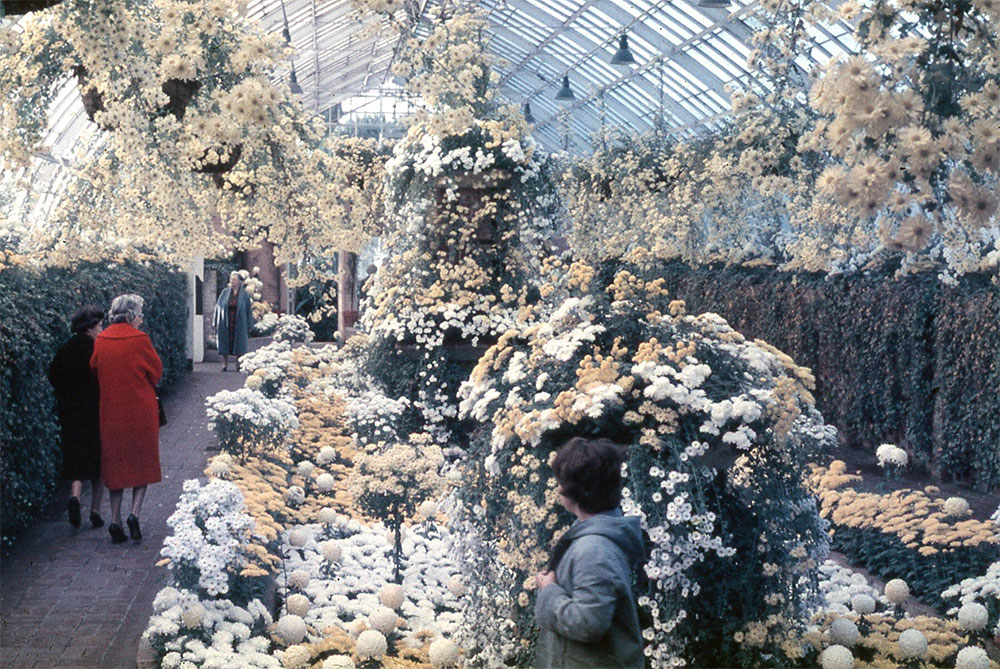 The 1969 Fall Flower Show celebrated the Diamond Anniversary of Phipps. The South Conservatory (then known as the Economic Room) featured a large floral diamond covered in white chrysanthemums.
