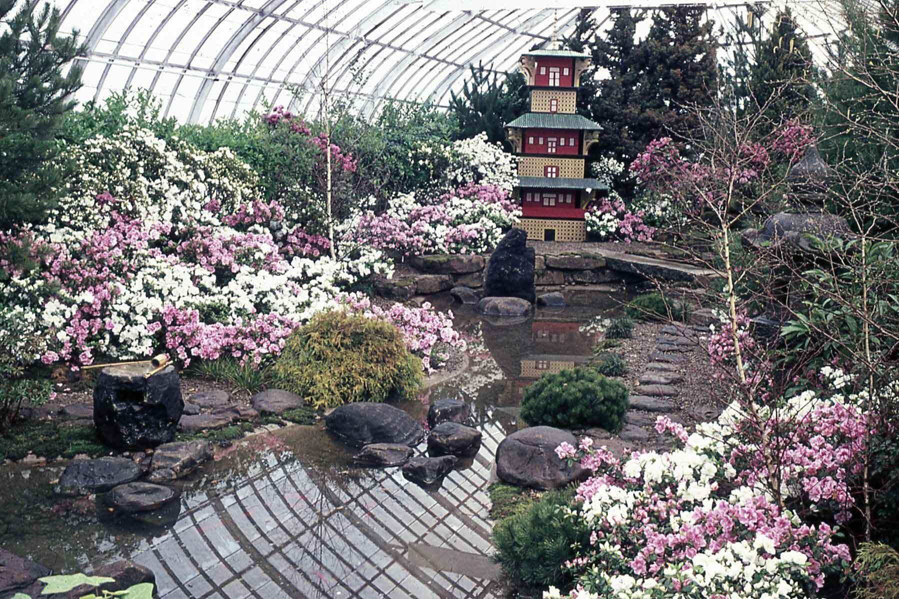 In 1963, the Cascade Garden (in what is now known as the East Room) was demolished. Frank Curto drew inspiration from his 1962 research trip to Japan and installed a display reminiscent of the gardens of the country, featuring a tori gate, arranged native stones and water features. The Japanese-style garden was ready in time for the 1963 Spring Flower Show, and was described as “timeless.” 50 A small wooden pagoda and large ornate lantern decorated the garden until the spring of 1964, when a bamboo teahouse took its place.