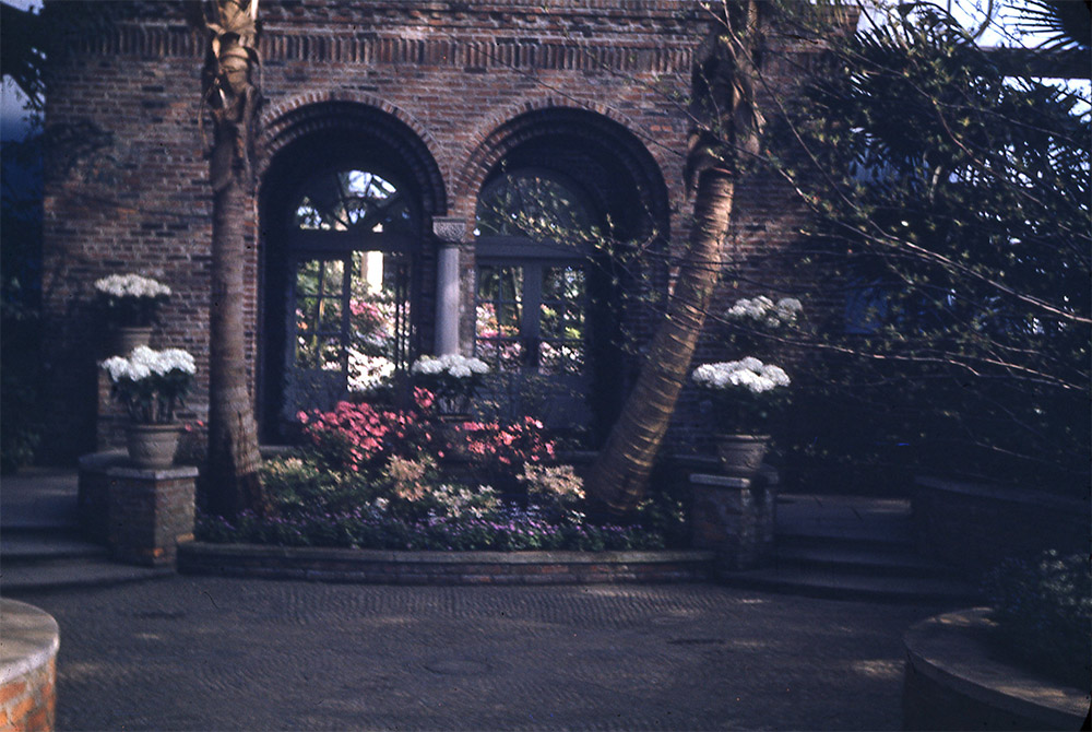 Another garden space in the Conservatory underwent renovations in 1964. The Cloister Garden was dismantled after 29 years, and landscape architect Ralph Griswold was commissioned to design what we know today as the Broderie Room. The “Broderie” style of Garden followed the 17th century “Parterre de Broderie,” or “embroidery on the earth” garden pattern. To aid appreciation of this design the garden was depressed and then inclined towards the rear of the space. A lattice trellis constructed of California redwood circled the perimeter, and ornamental Oxford bricks topped the wall at the entrance to the garden and formed the edges to the steps. This brick was sourced from Alwine Company in Gettysburg, PA. Broderie Garden construction involved a group effort with Phipps staff, City of Pittsburgh Department of Lands and Building and the Division of Construction and Repairs of the Parks Department. Design and materials were funded by longtime Phipps affiliates, the Garden Club of Allegheny County.